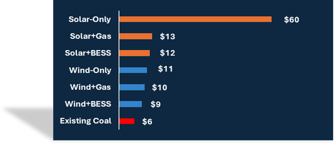 Energy Ventures Analysis (EVA) analyzed the annual cost of replacing coal power plants that are scheduled to retire with six renewable sources of electricity: solar alone, solar firmed by battery energy storage systems (BESS) or natural gas, wind alone, and wind firmed by BESS or natural gas. BESS and natural gas are firming resources that generate power when the wind isn’t blowing or the sun isn’t shining. However, BESS is expensive and produces power for only a few hours. Natural gas also can be expensive when prices spike, and it is sometimes in short supply, especially during extreme weather.