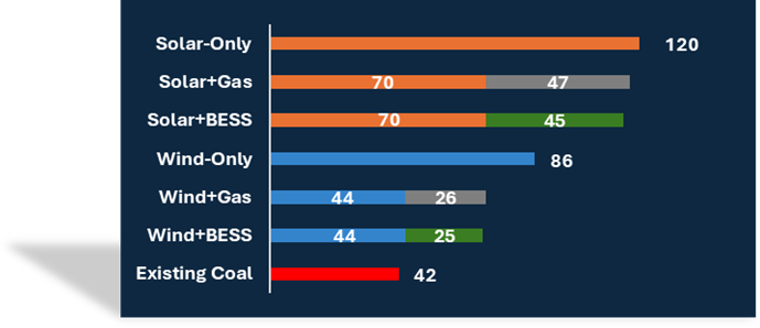 Exhibit 2 shows the amount of generating capacity required to replace 42 GW of retiring coal capacity. Solar+gas and solar+BESS show the capacity of solar power (orange) plus the firming capacity (grey for natural gas and green for BESS). For example, solar+gas means 70 GW of solar plus 47 GW of natural gas. Similarly, wind+gas and wind+BESS show the amount of wind capacity (blue) plus firming capacity (grey for natural gas and green for BESS).