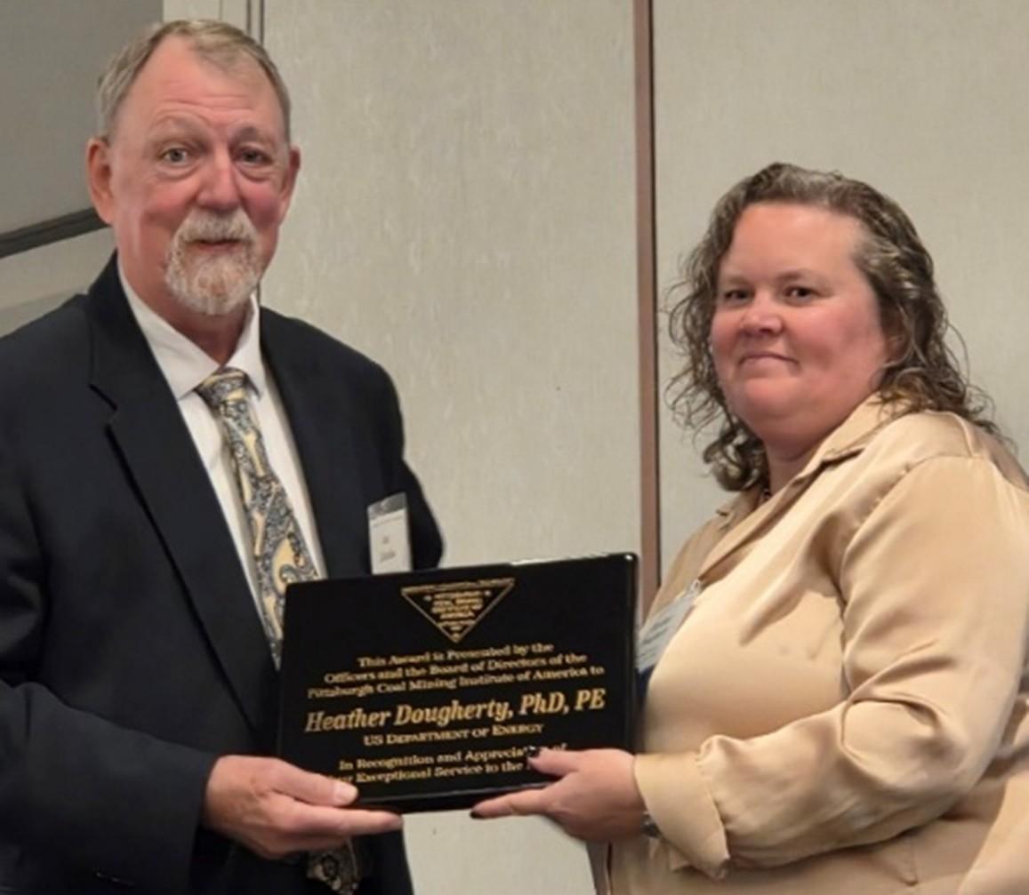 December 22, 2025 - Heather Dougherty, an NETL research engineer whose work has supported a range of fossil energy initiatives, was recently honored by the Pittsburgh Coal Mining Institute of America (PCMIA) for outstanding service and dedication to the mission of the organization.