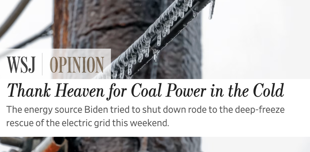January 26, 2026 - The Wall Street Journal hit the nail on the head this weekend in an editorial titled “Thank Heaven for Coal Power in the Cold.” Winter storm Fern has wreaked havoc across a 2,000-mile stretch of the country leaving hundreds of thousands without power. If not for coal generation, it would be millions more.