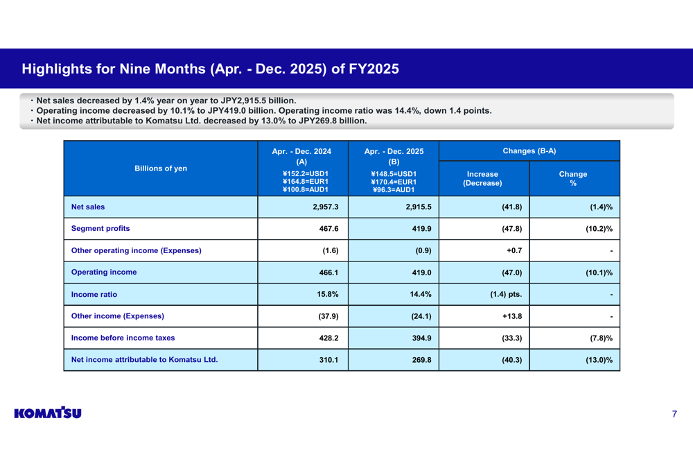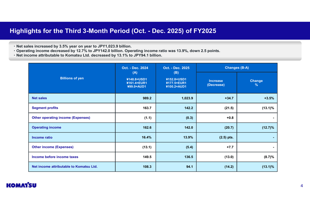 February 3, 2026 - Komatsu Ltd. (TYO:6301) released its third-quarter fiscal year 2025 results on January 30, 2026, revealing a mixed performance characterized by sales growth but declining profits. The construction and mining equipment manufacturer’s stock responded positively to the results, rising 4.79% to close at ¥6,213, as the company’s performance exceeded analyst expectations despite operational challenges. The results come amid a complex global economic environment for heavy equipment manufacturers, with regional variations in demand and ongoing supply chain pressures affecting the industry. Komatsu’s ability to grow revenue despite these headwinds demonstrates the company’s market resilience, though profit margins have come under pressure. Quarterly Performance HighlightsFor the three months ended December 31, 2025 (Q3 FY2025), Komatsu reported net sales of ¥1,023.9 billion, representing a 3.5% increase year-on-year. However, operating income declined by 12.7% to ¥142.0 billion, resulting in an operating income ratio of 13.9%. Net income attributable to Komatsu Ltd. decreased by 13.1% to ¥94.1 billion. As shown in the following quarterly highlights chart: