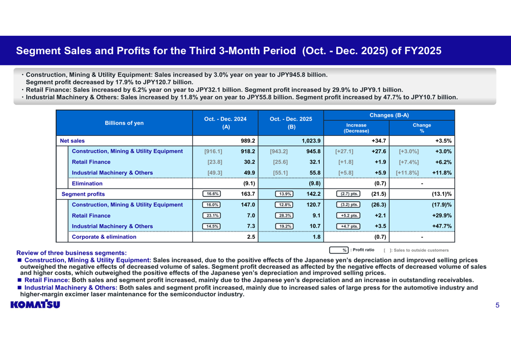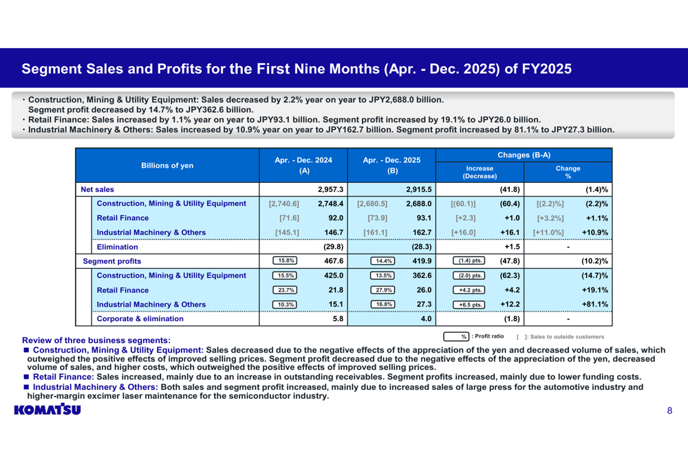 The company’s earnings per share reached ¥104.02, surpassing the forecast of ¥96.41 by 7.89%, according to market data. This positive surprise helped drive investor confidence despite the profit decline, as it demonstrated Komatsu’s ability to outperform expectations in a challenging environment. For the nine-month period (April-December 2025), the company’s performance showed similar trends with net sales decreasing by 1.4% year-on-year to ¥2,915.5 billion and operating income declining by 10.1% to ¥419.0 billion. The nine-month operating income ratio stood at 14.4%, while net income attributable to Komatsu Ltd. decreased by 13.0% to ¥269.8 billion. The following chart illustrates the nine-month performance metrics: Segment AnalysisKomatsu’s business segments showed divergent performance in Q3 FY2025. The core Construction, Mining & Utility Equipment segment, which accounts for the majority of the company’s business, saw sales increase by 3.0% year-on-year to ¥945.8 billion. However, segment profit decreased significantly by 17.9% to ¥120.7 billion, indicating substantial margin pressure. In contrast, the Retail Finance segment demonstrated strong profit growth with sales increasing by 6.2% to ¥32.1 billion and segment profit rising by 29.9% to ¥9.1 billion. The Industrial Machinery & Others segment was the standout performer, with sales increasing by 11.8% to ¥55.8 billion and segment profit surging by 47.7% to ¥10.7 billion. The segment breakdown for Q3 is illustrated in the following chart: