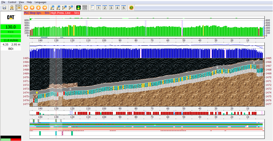 Cat Advanced Automation Control uses state-based automation, which enables the shearer to operate precisely to the mining company’s defined production process, including direction of travel, speeds, arm height and ranging arm control modes. As many as 200 states are defined, and specific actions and conditions must be met before the system enters the next state. The system is available as shearer automation only or as integrated longwall automation. The latter offers improved face alignment and horizon control, as experienced at Narrabri.