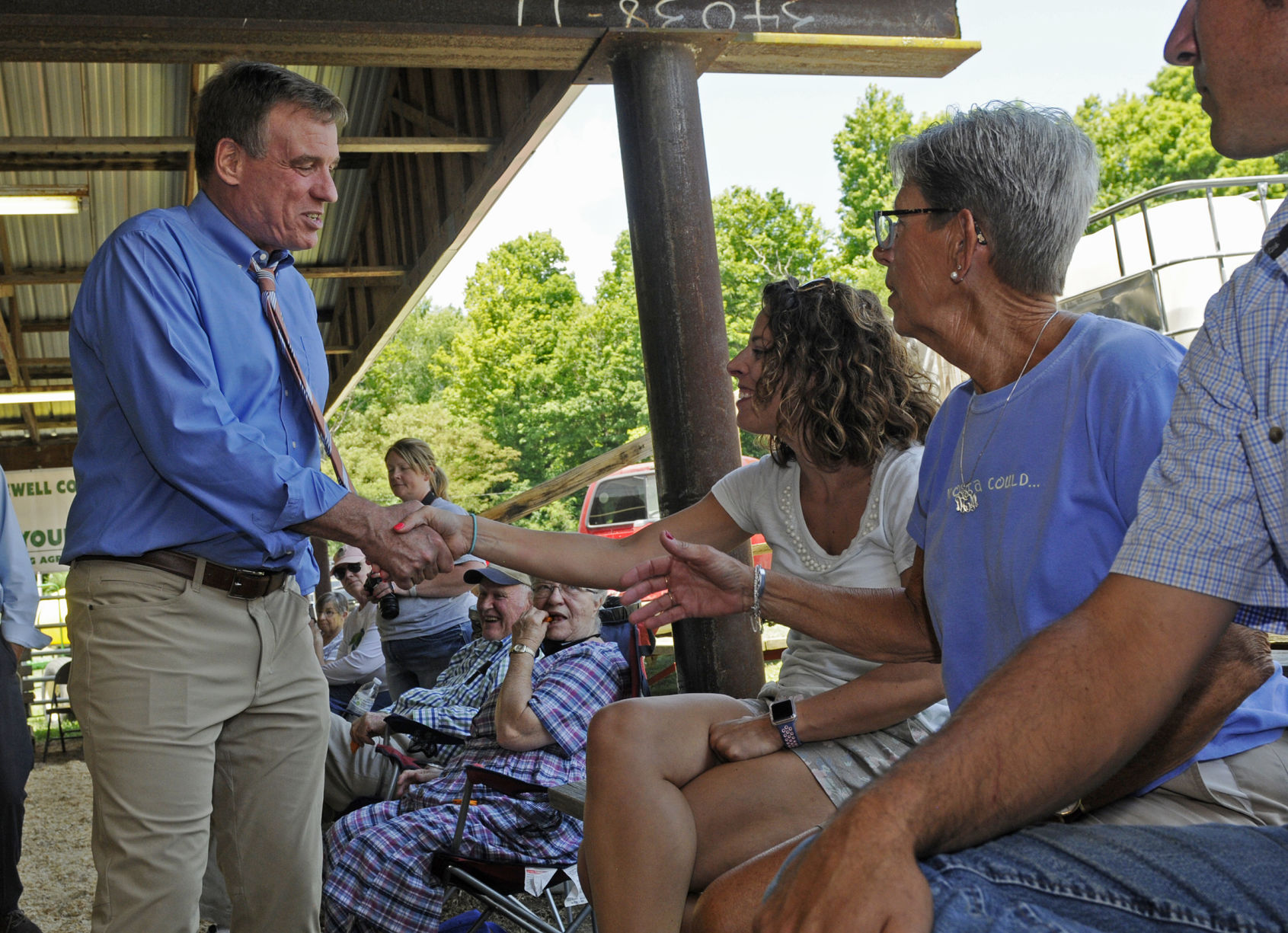 U.S. Sen. Mark Warner, D-Va., greets local residents as he makes his way around the audience during the 4-H FFA Market Lamb Show in the barn at the Tazewell County Fair Saturday.