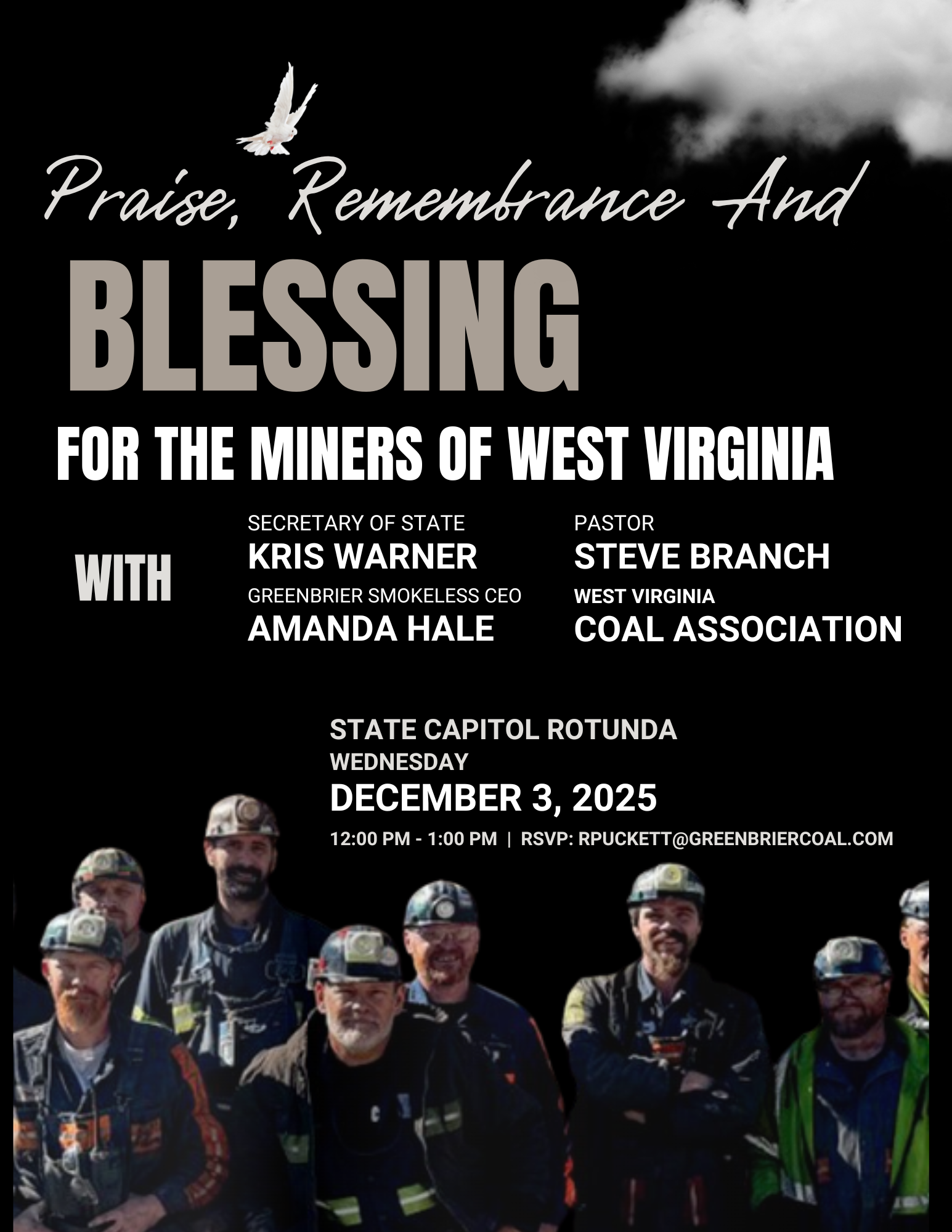 November 21, 2025 - Please attend the Rally: Praise, Remembrance and Blessing for the Miners of West Virginia to be held in the State Capitol Rotunda on Wednesday, December 3, 2025 noon till 1:00 pm.
