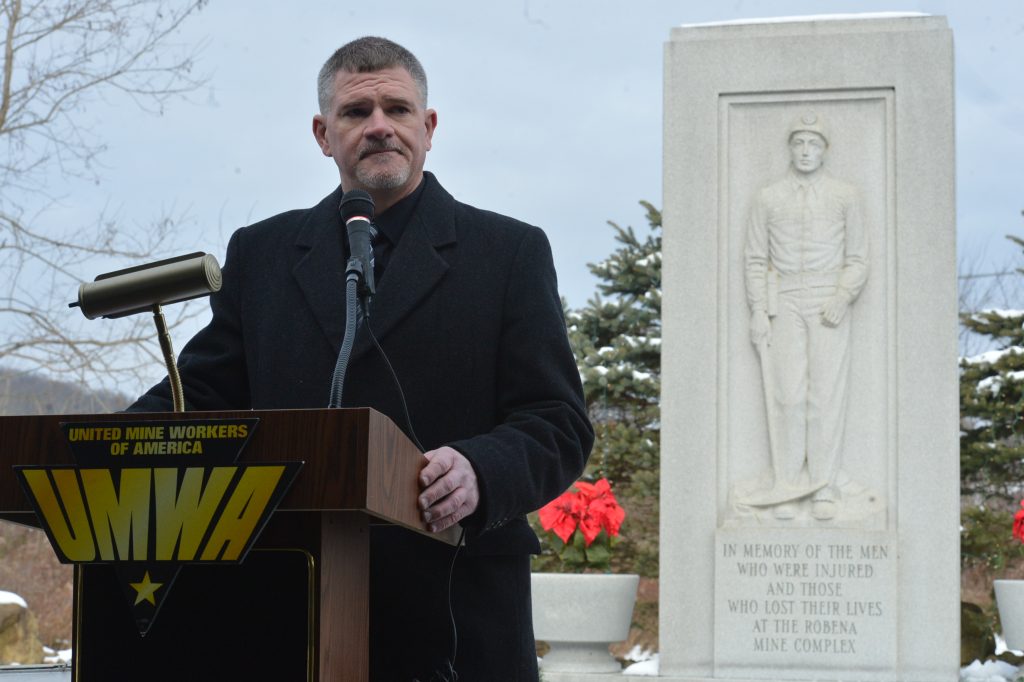 Brian Sanson, international president of United Mine Workers of America, delivers the keynote speech at Saturday’s memorial ceremony marking the 63rd anniversary of the Robena Mine disaster.