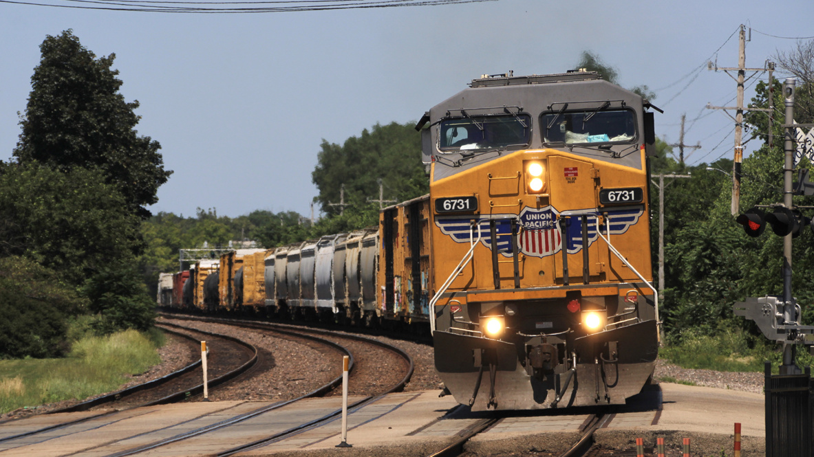 A westbound Union Pacific manifest freight crosses Hill Avenue in Wheaton, Ill., on June 28, 2025.