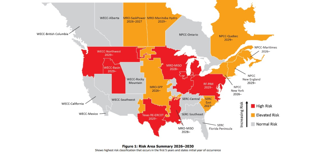 NERC found that 13 of 23 assessment areas face resource adequacy challenges over the next decade. Even that metric understates how critical the situation has become. PJM Interconnection, serving 67 million Americans, along with the MISO, ERCOT, WECC-Basin and WECC-Northwest grids are all at high-risk of energy shortfalls in just the next five years.