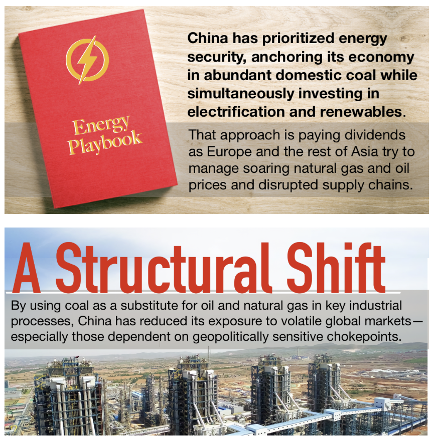 By using coal as a substitute for oil and natural gas in key industrial processes, China has reduced its exposure to volatile global markets—especially those dependent on geopolitically sensitive chokepoints.