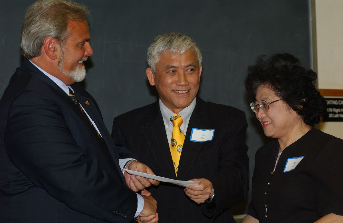 For his leadership in mining education, WVU President Michael T. Benson has selected Syd Peng (center), Charles E. Lawall Chair of Mining Engineering Emeritus in the WVU Benjamin M. Statler College of Engineering and Mineral Resources, for the first Presidential Honorary Degree he will bestow. Peng is shown at a 2001 ceremony with his late wife, Felicia Peng (right), a former professor of mining engineering, and Eugene Cilento (left), former dean of the Statler College. (WVU Photo)