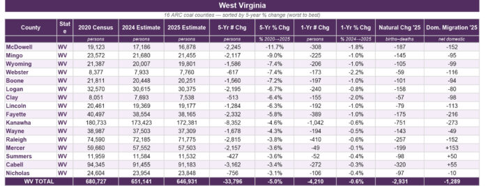 April 16, 2026 - Sixteen West Virginia counties that are part of the Appalachian Regional Commission’s Central Appalachia region saw the largest percentage of population loss from that entire group from the 2020 census to 2025 numbers, according to the U.S. Census Bureau. Parts of Kentucky, West Virginia, Virginia and Tennessee make up the Central Appalachia region. The 16 counties in the Mountain State run along the southern coal fields.