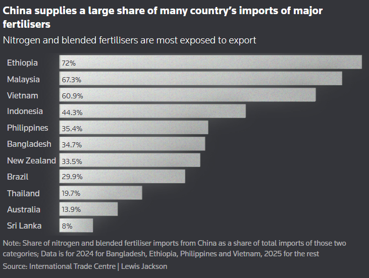 Last year, China accounted for roughly a fifth of fertilizer imports by Brazil, Indonesia and Thailand as well as a third of those by Malaysia and New Zealand, data from the International Trade Centre shows. For India, the share was about 16%, its trade data shows.