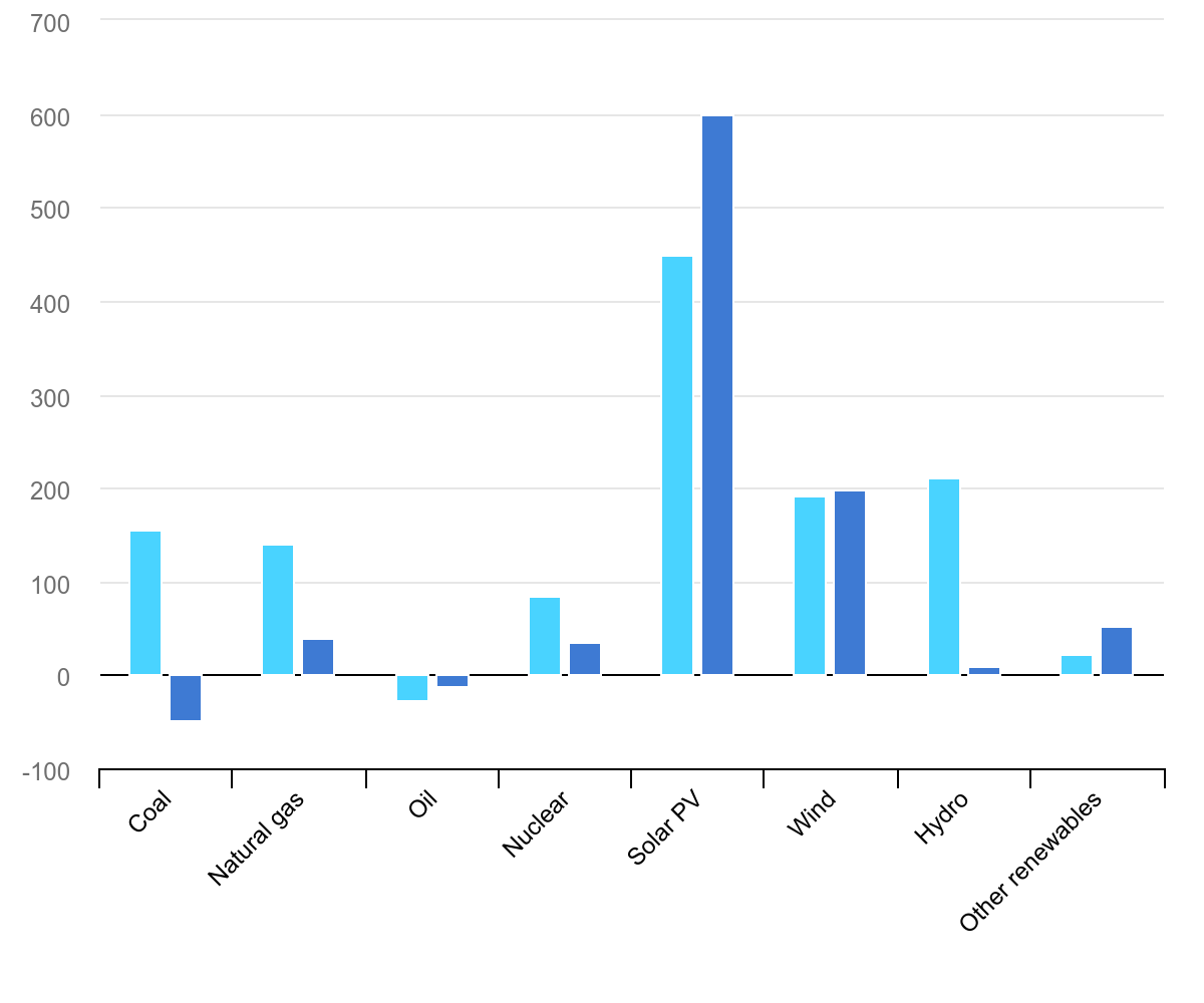 Global electricity generation increased by over 850 TWh in 2025, with renewables accounting for the vast majority of growth. Together, generation from renewables and nuclear power rose by more than the total global increase in generation. In contrast, generation from fossil fuels declined: a modest rise in natural gas-fired generation was outweighed by a decline for coal. Global coal-fired generation fell by around 0.5%, marking the first decrease since the Covid-driven drop in 2020 and the first decline outside of a period of crisis-related disruption since 2015. As a result, in line with previous IEA forecasts, global renewable generation virtually matched coal-fired generation in 2025.