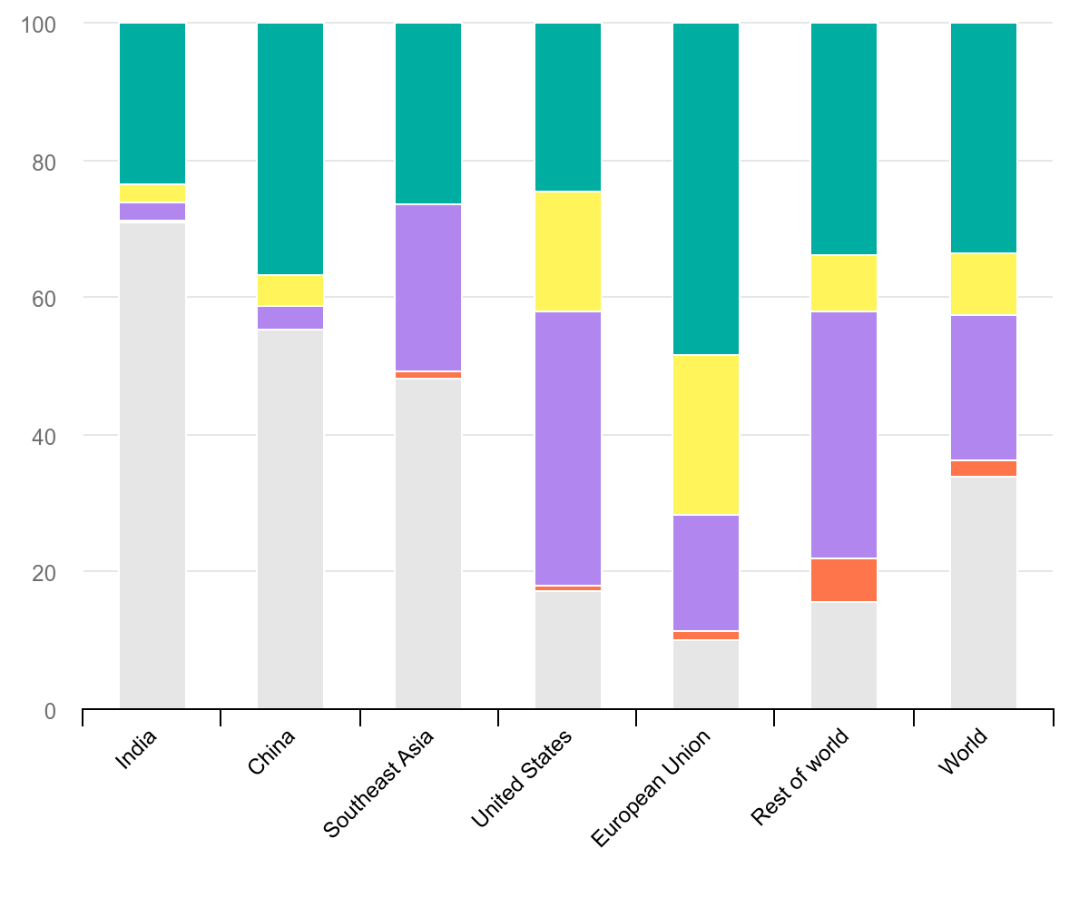 In emerging market and developing economies such as China, India and Southeast Asia, coal remained the dominant source of electricity. Nevertheless, due to the rapid expansion of low-emissions sources, the share of coal-fired generation in China declined to 55% in 2025, down from 70% a decade ago. In India, it edged down to 71% in 2025 from 74% in 2024 and 76% back in 2015. In Southeast Asia, by contrast, the share of coal-fired generation remained at 48% in 2025, similar to its 2024 share, and up from 37% a decade ago. Renewables increased to 32% of electricity generation across emerging market and developing economies, while nuclear remained at close to 5%.