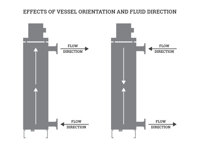 These diagrams compare the effects of vessel orientation and fluid flow direction on heat transfer. The heater on the left offers the best heat transfer capability because forced convection and natural convection are working together.